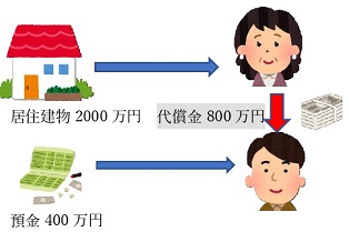 法定相続分に応じて遺産分割により配偶者が居住建物及びその敷地を取得しようとする場合、これらを取得すると配偶者の法定相続分(1200万円)をオーバーしてしまうので、子に400万円の預金を取得させたうえで、法定相続分に不足する800万円を配偶者が代償金として支払う必要があります。